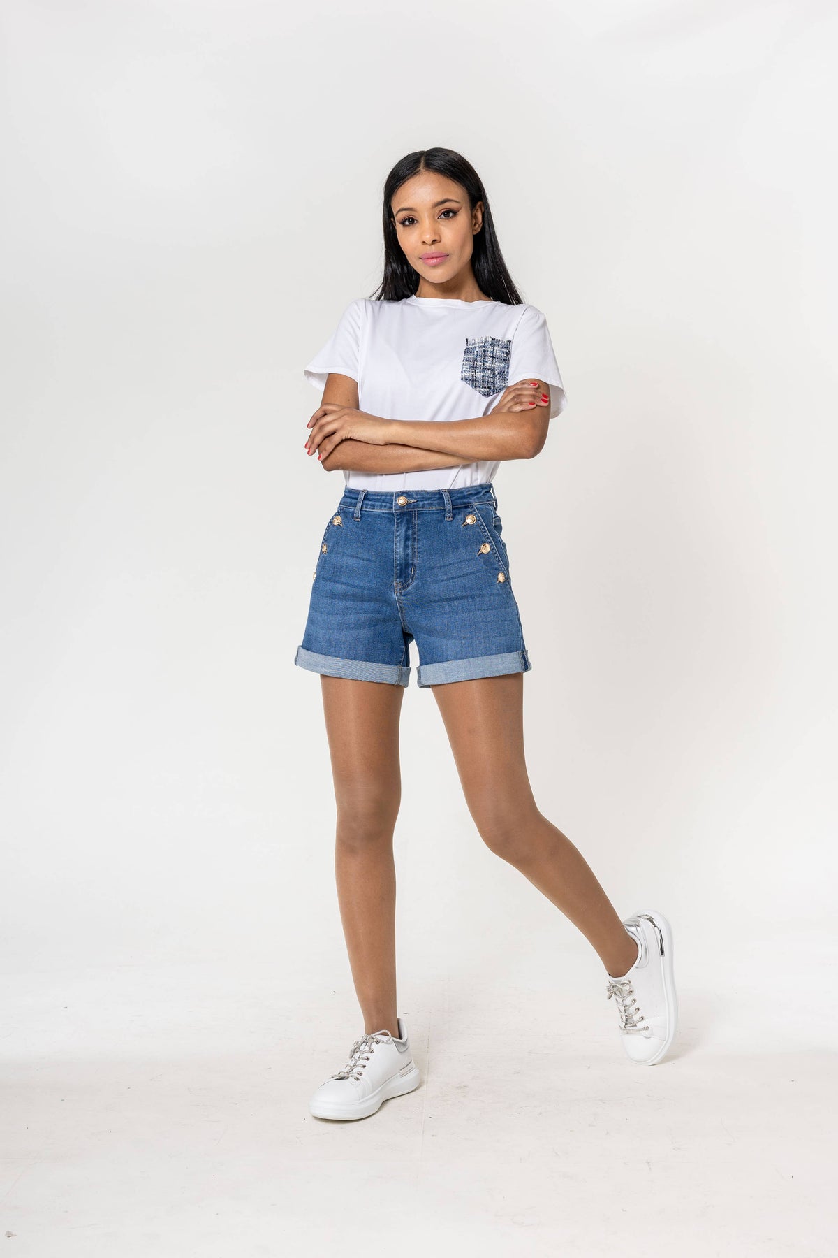High Waisted Stretch The front and back pockets are enhanced with shaped details and gold buttons, adding unique character and a boutique-inspired flair. The high-quality denim ensures durability while providing a flattering fit that hugs your silhouette. The zipper and button accents not only serve as functional features but also elevate the shorts with a polished, fashion-forward look.